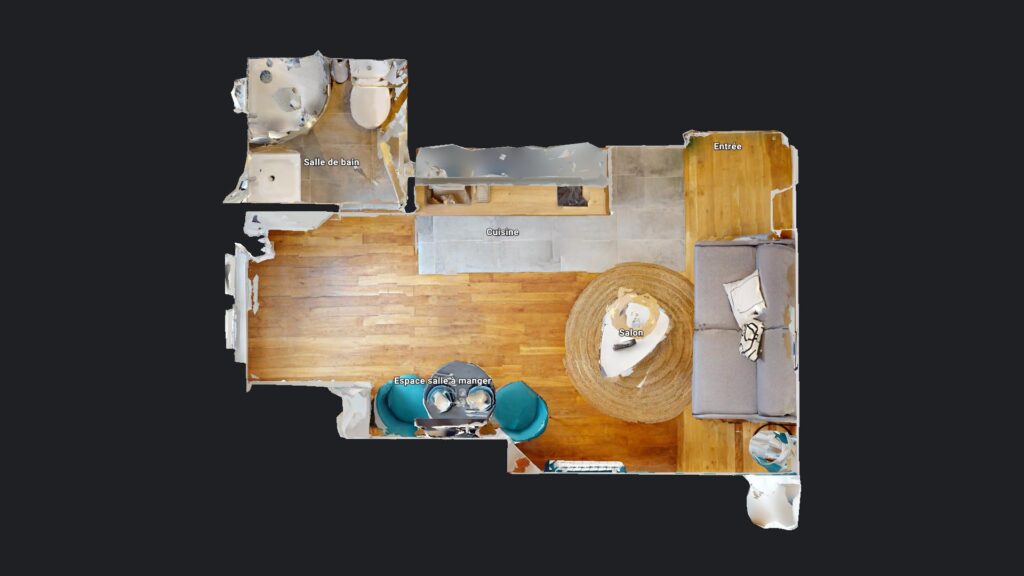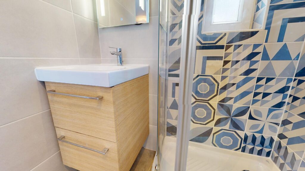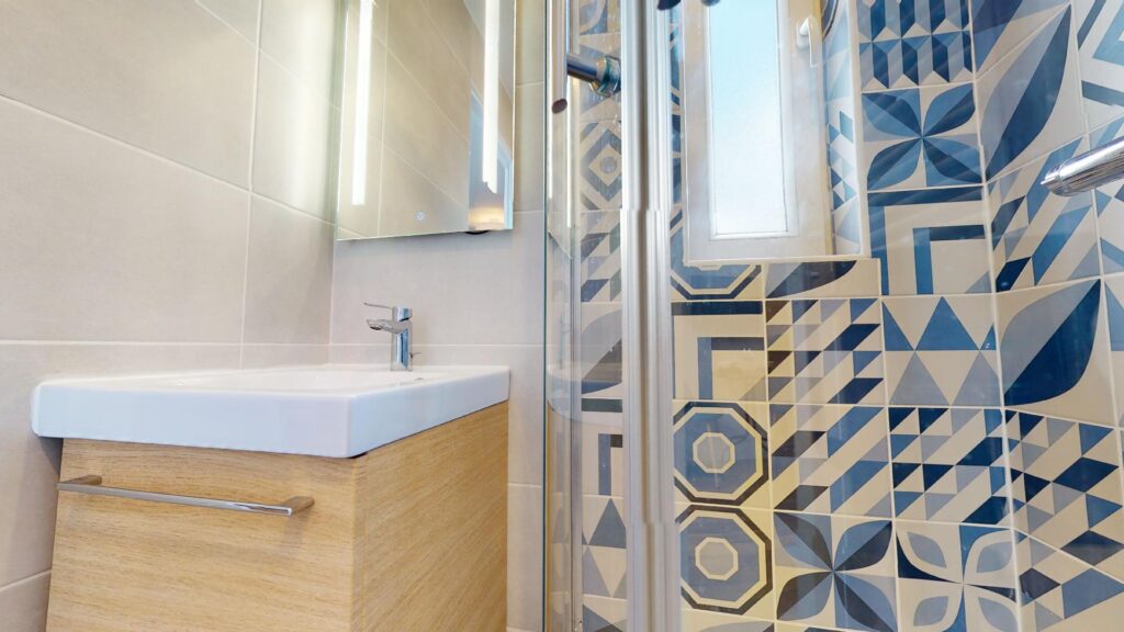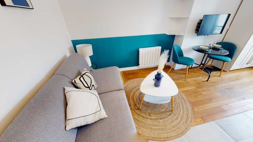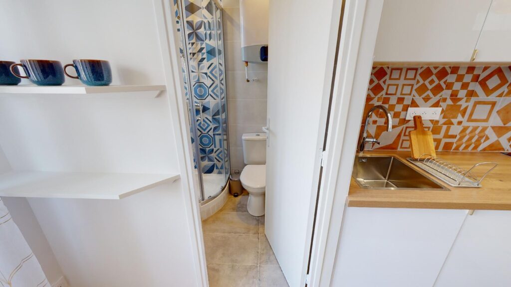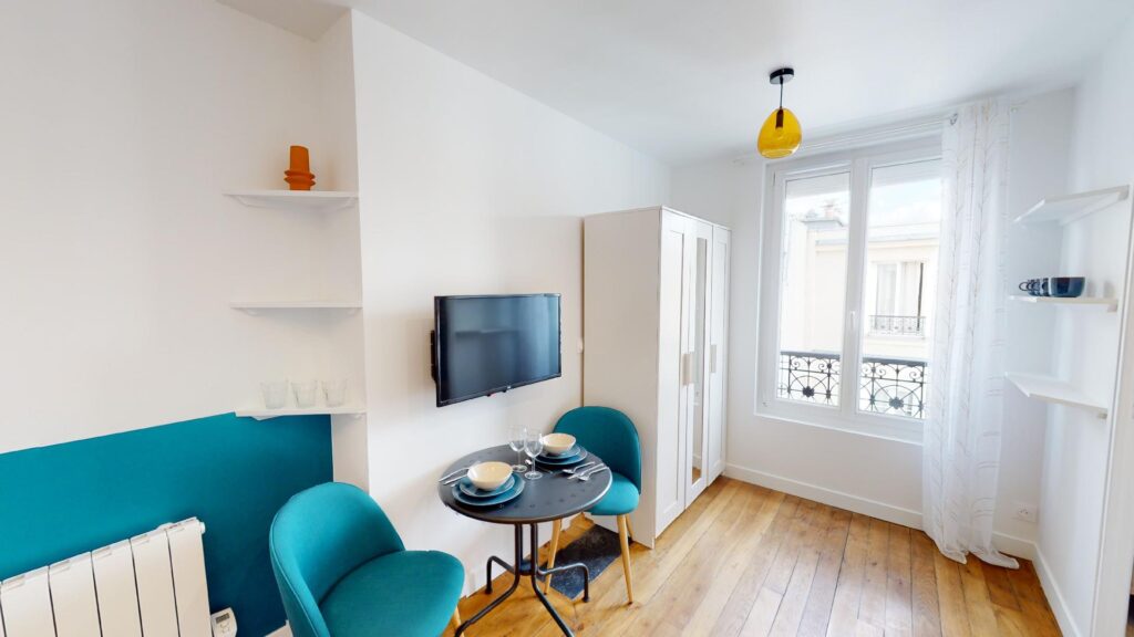 Le studio est lumineux et a été très joliment agencée. Il dispose d’un espace cuisine (équipée de plaques de cuisson et de rangements), d’un espace de vie convertible en espace de nuit grâce à son canapé dépliant, d’une table à manger accompagné de ses chaises et d’un TV murale. Une salle de bain neuve et séparée se découvre, munie de meuble vasque, de sa douche et d’un toilette.