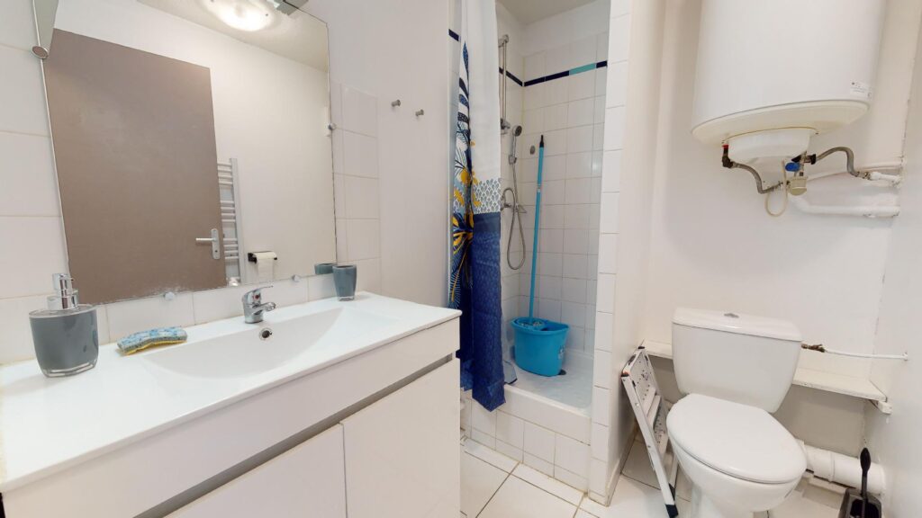 La salle de bain est équipée d’un toilette, d’une douche et d’un meuble vasque.