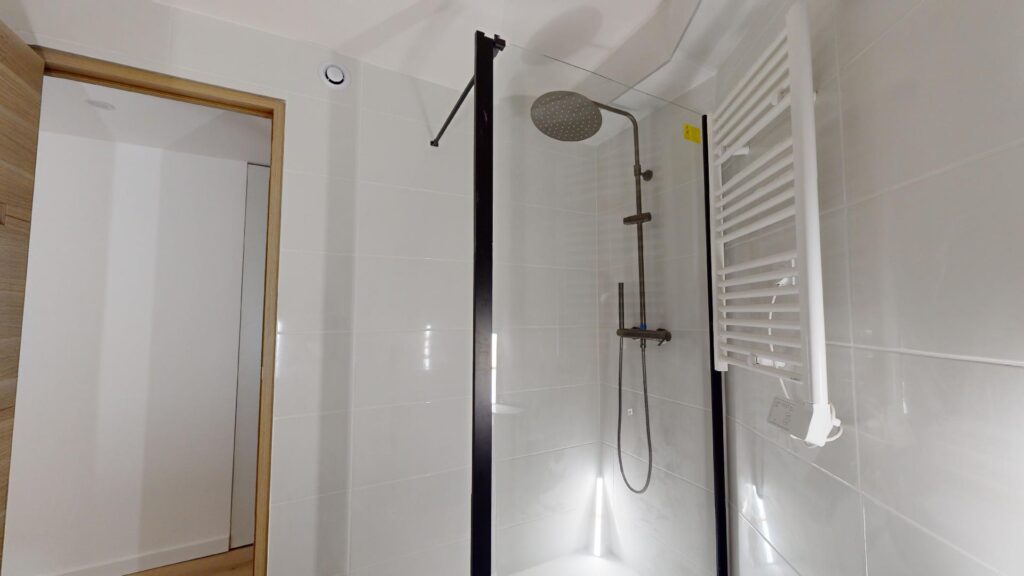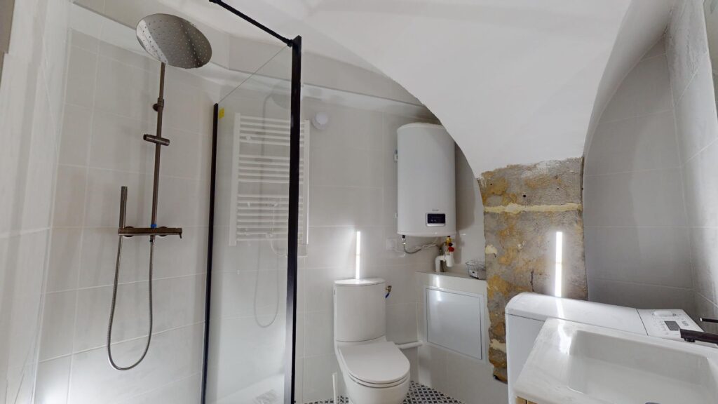 La salle de bain, est équipée d’une douche, d’un meuble vasque, d’une machine à laver et d’un WC.