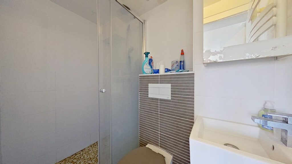 La salle d’eau comporte une douche, un meuble vasque, sèche-serviette ainsi que des rangements et WC.