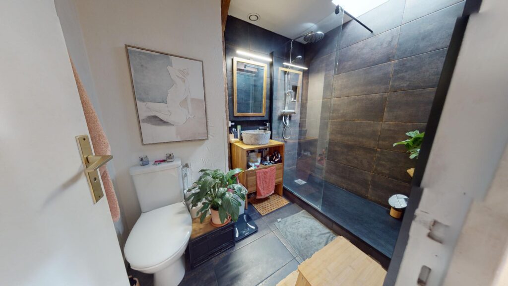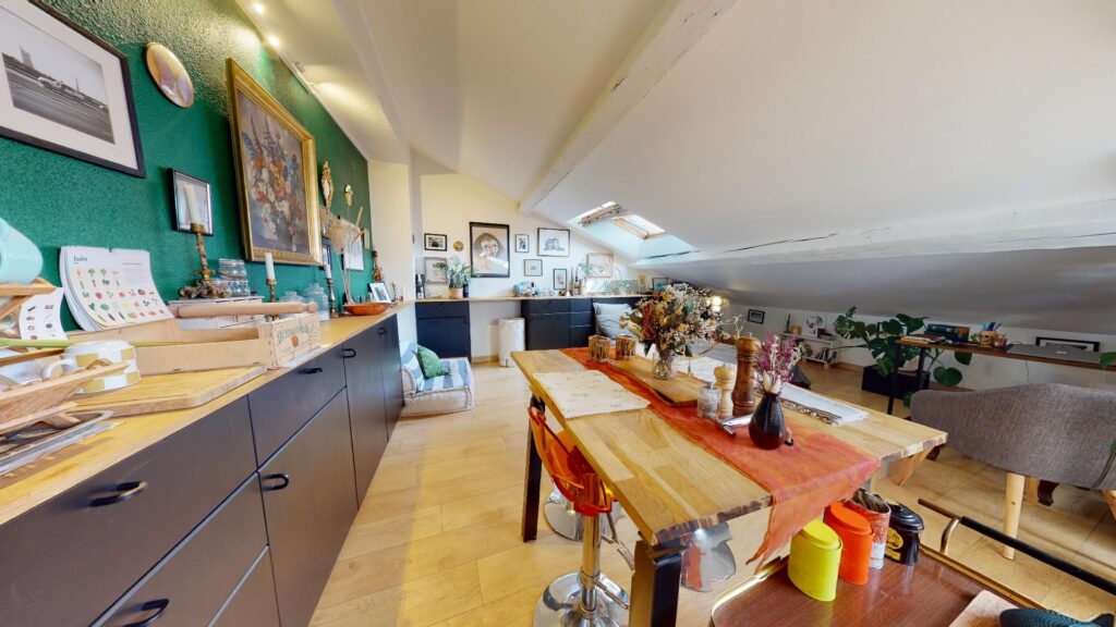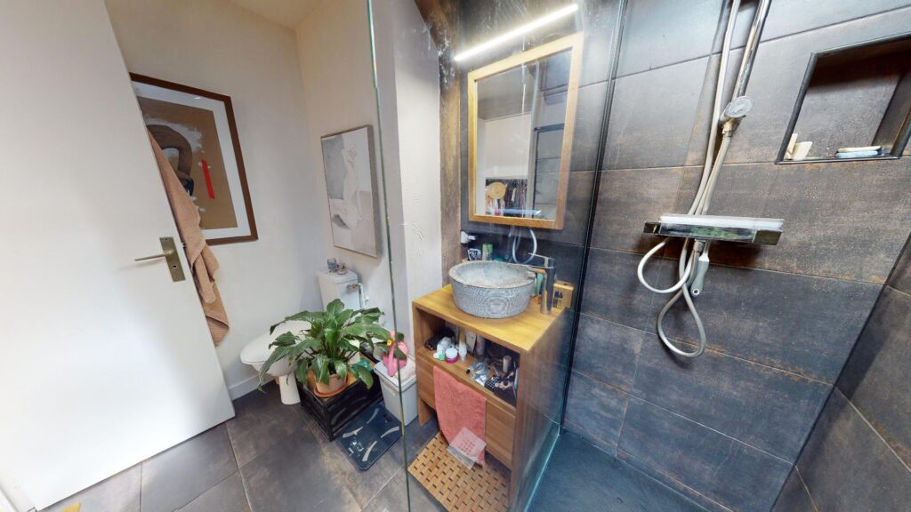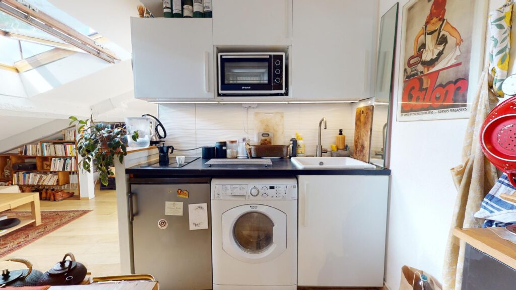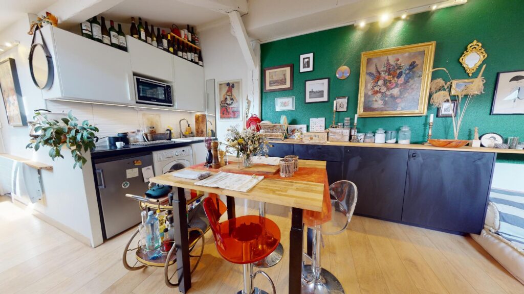 Ce joli studio, proposant une surface au sol de 57 m², dispose d’un coin bureau surélevé en mezzanine, d’un coin salon équipé d’une banquette et d’une table basse, d’une salle de bain équipée d’une jolie douche à l’italienne, de toilettes et d’un meuble vasque, d’un coin nuit proposant un lit double et un second bureau, le tout complété par un coin cuisine/salle à manger équipé d’une table, de ses trois tabourets, d’un long plan de travail, d’un four à micro-ondes, d’une machine à laver et d’un petit réfrigérateur.