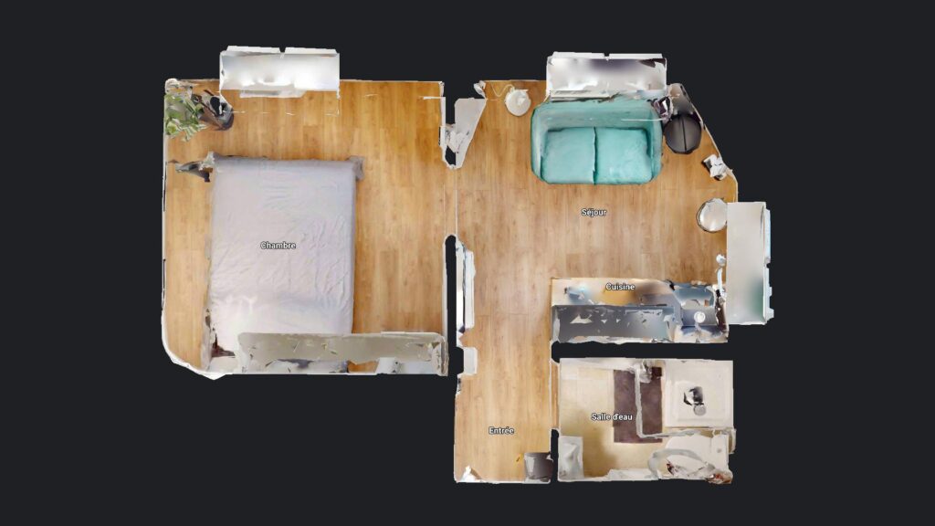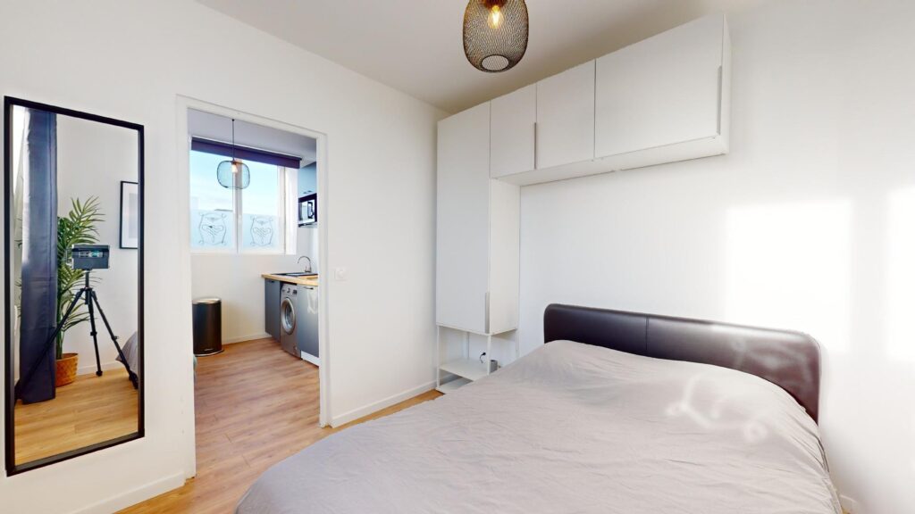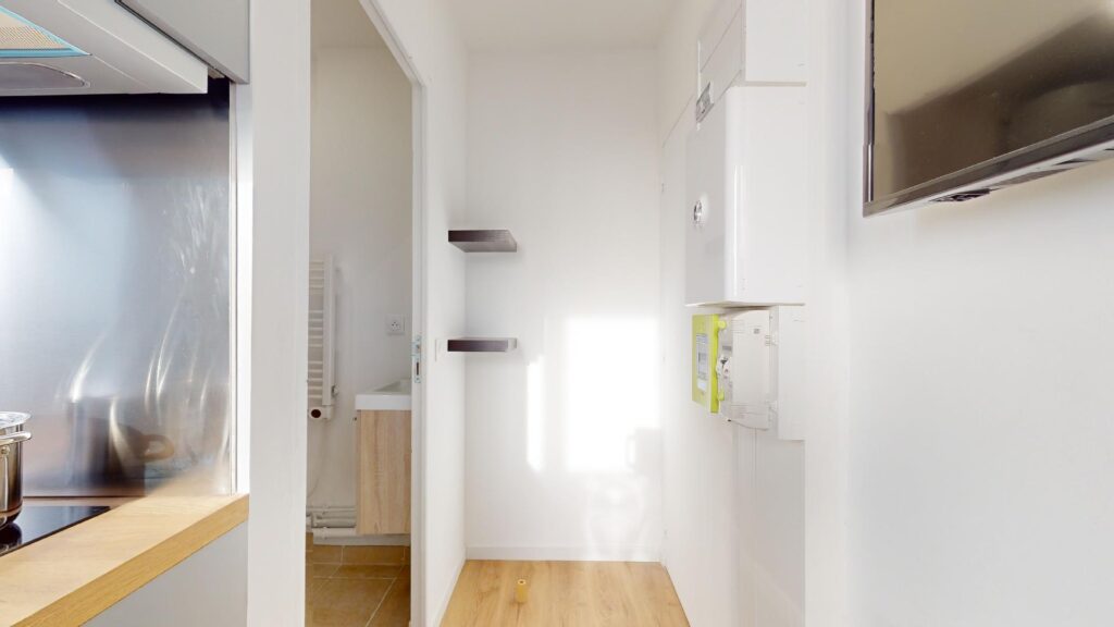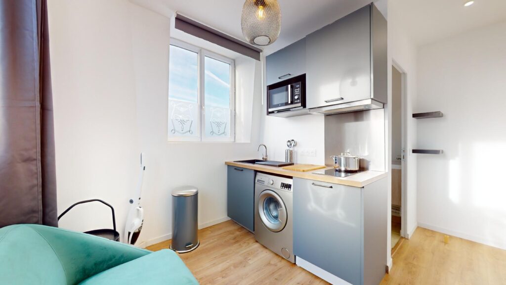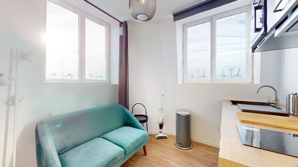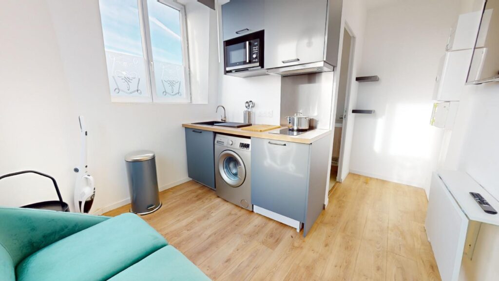 Ce T1 bis s’ouvre sur une pièce de vie aménagée d’un canapé, une table basse, une table avec deux chaises et une télévision. La cuisine est équipée d’un réfrigérateur, une machine à laver, un évier avec égouttoir, des plaques de cuisson avec une hotte, un micro-ondes ainsi que de nombreux rangements.