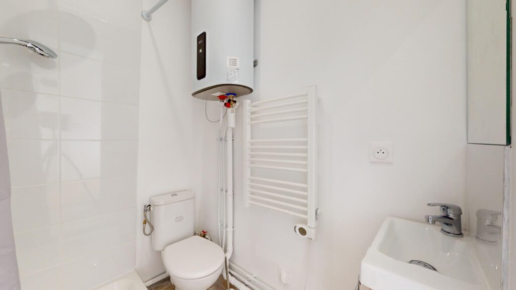 La salle d’eau dispose d’une douche, un WC, un porte-serviettes radiateur ainsi qu’un meuble vasque avec un miroir.