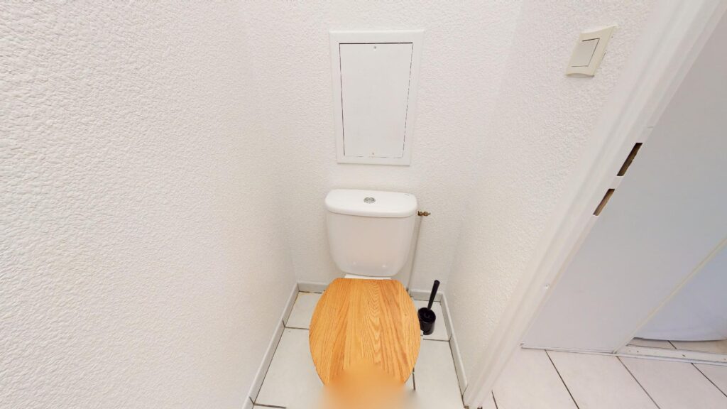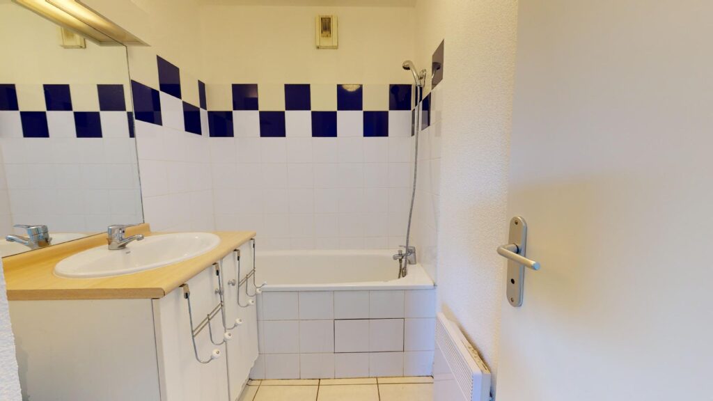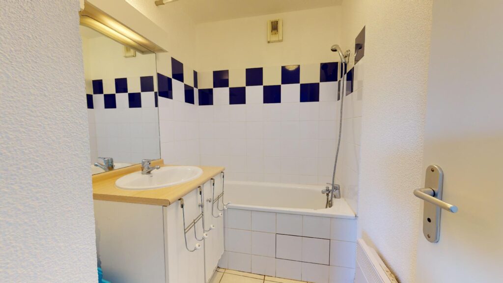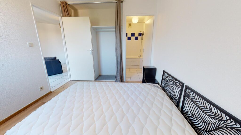 La chambre séparée est idéalement meublée avec tout le nécéssaire : lit double, petites commodes de nuit, et un grand placard de rangement. La salle de bain est attenante à la chambre et comporte un meuble vasque avec rangements, et une baignoire. Les Wc sont séparés.