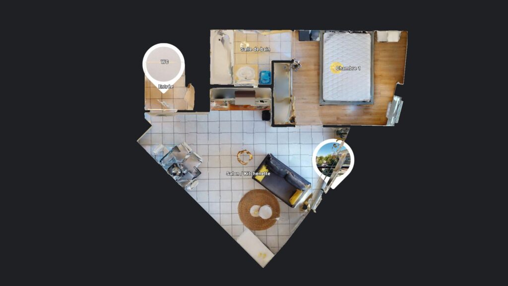 Le coin salon est équipé avec un canapé, tables basses gigognes et meuble TV. Il s’ouvre sur un balcon, idéal pour les beaux jours.