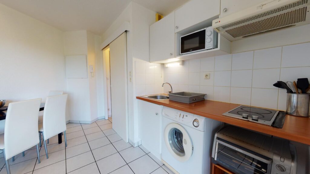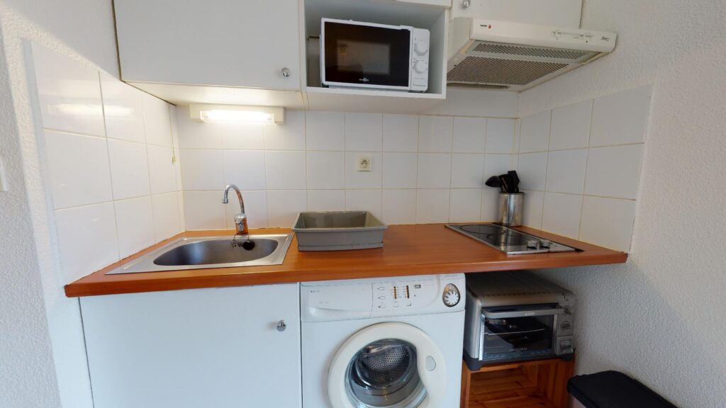 La Kitchenette comporte une machine à laver, micro-onde, plaques de cuisson, hotte, four et placard de rangement. Le grand frigo se trouve dans l’entrée.