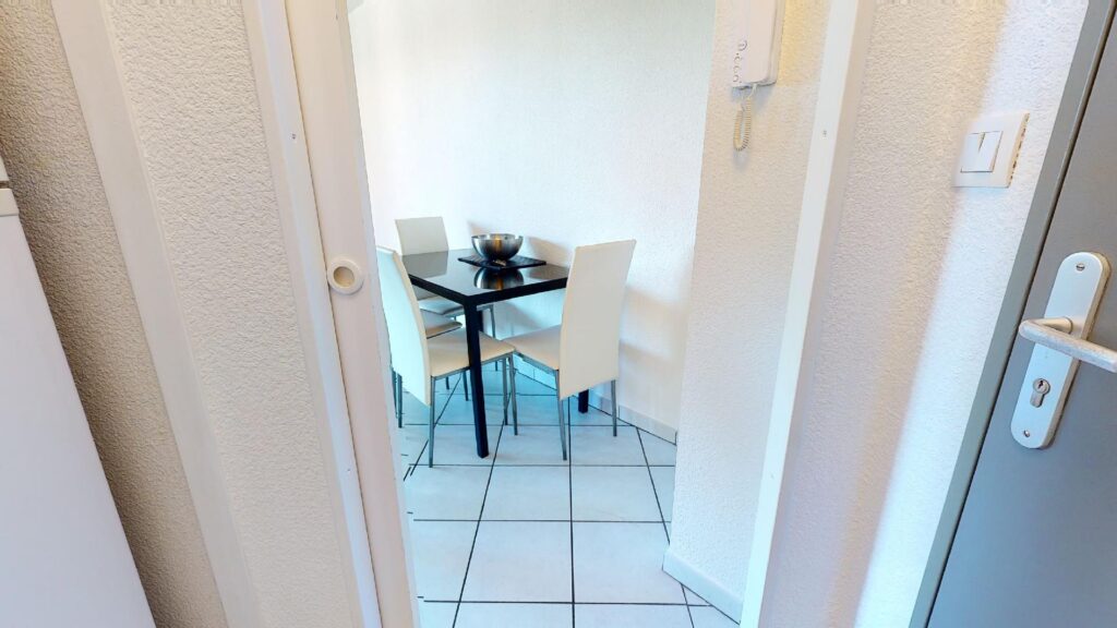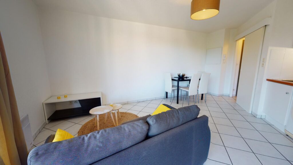 Le logement s’ouvre sur une pièce de vie avec espace salle à manger avec table à manger, chaises et kitchenette et un coin salon.