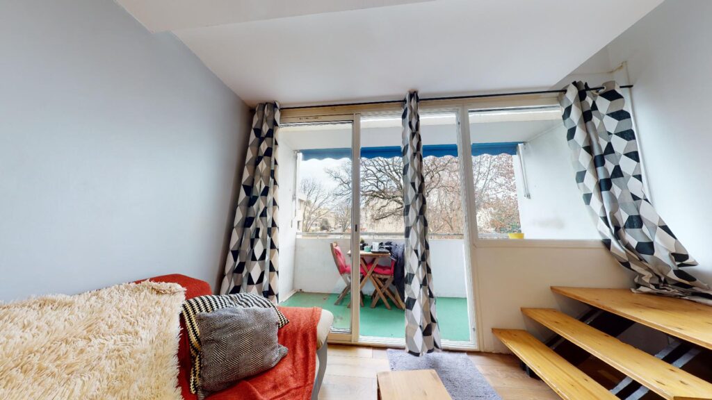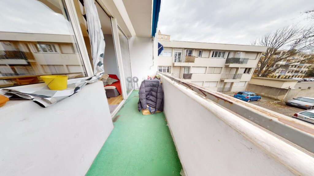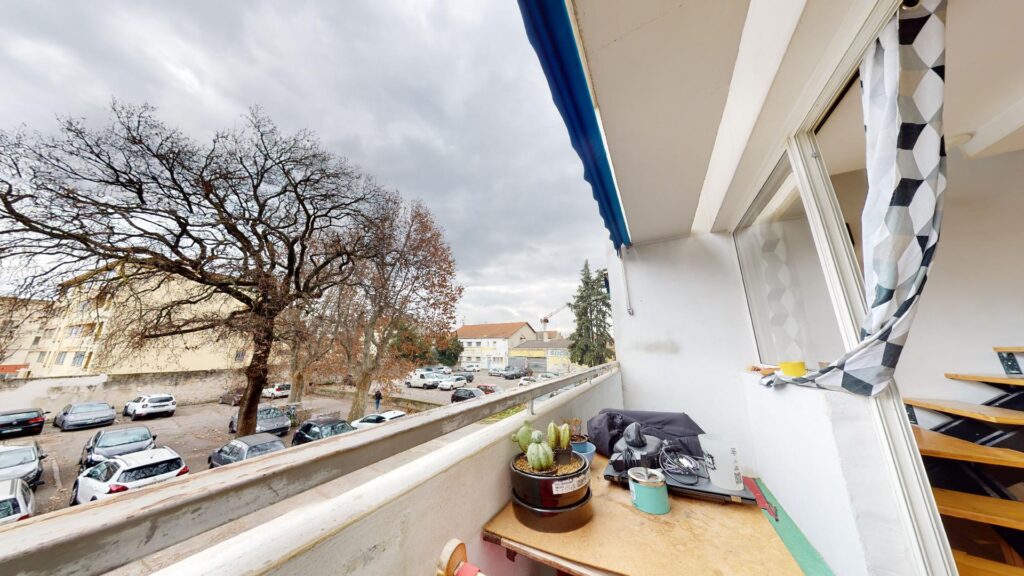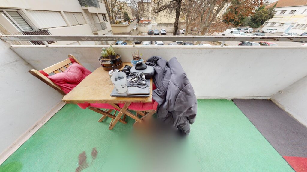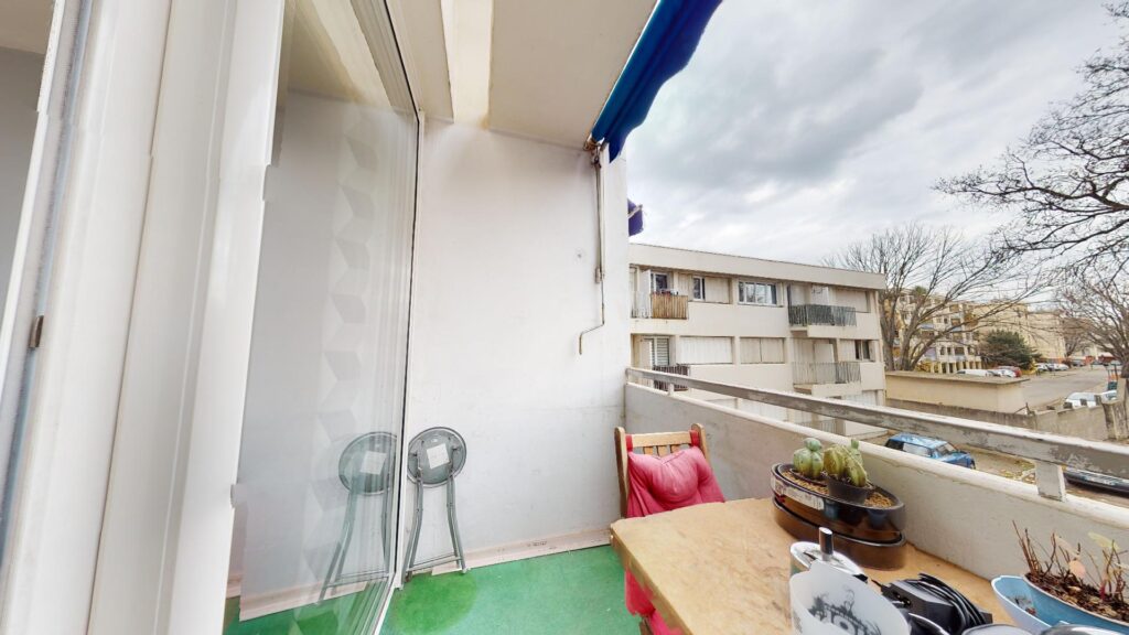 Le balcon possède une table avec deux chaises pour déjeuner pendant les beaux jours, et apporte une vue dégagée sur la résidence.