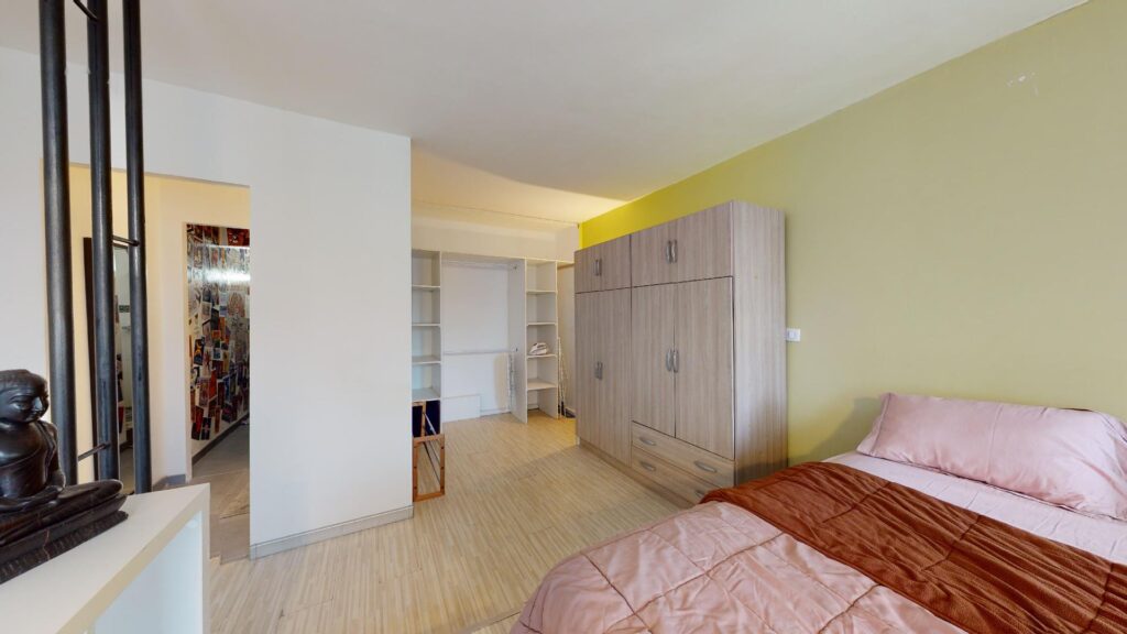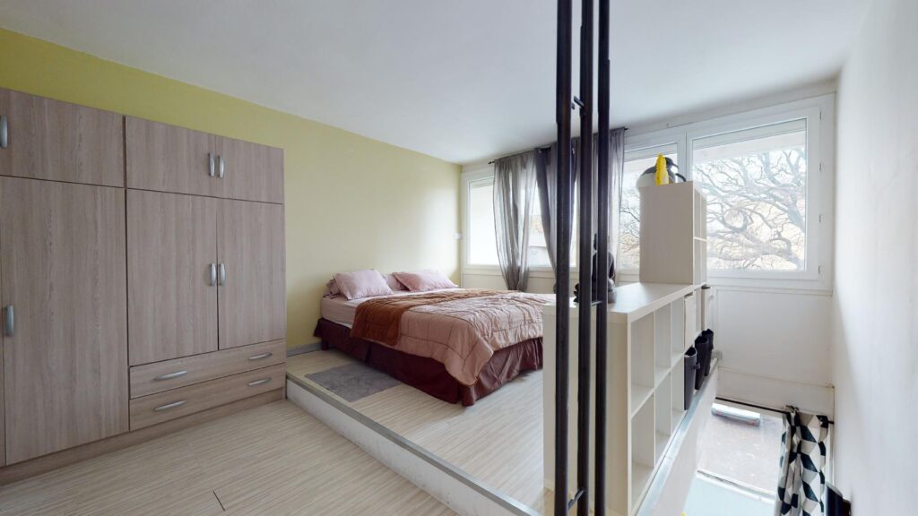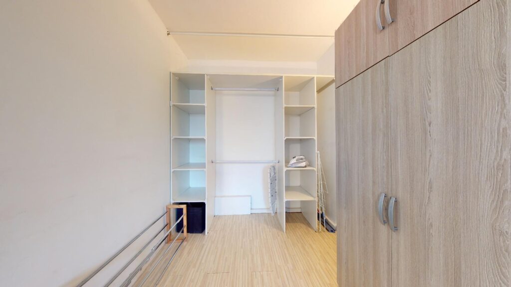 A l’étage accessible depuis un escalier moderne, on retrouve la chambre qui est agencée avec un lit double, un côté dressing avec une grande armoire et de nombreux bloc de rangements.