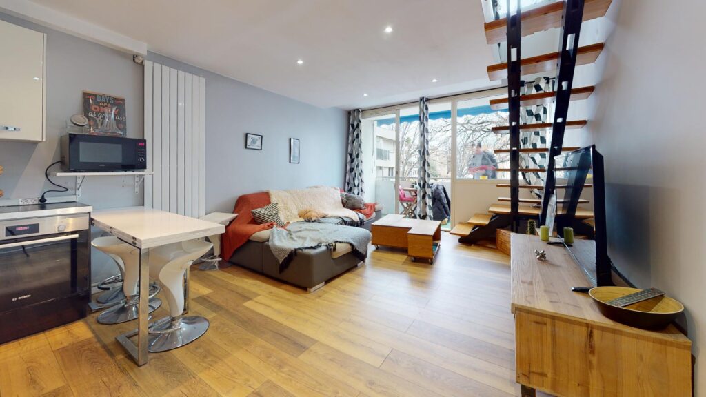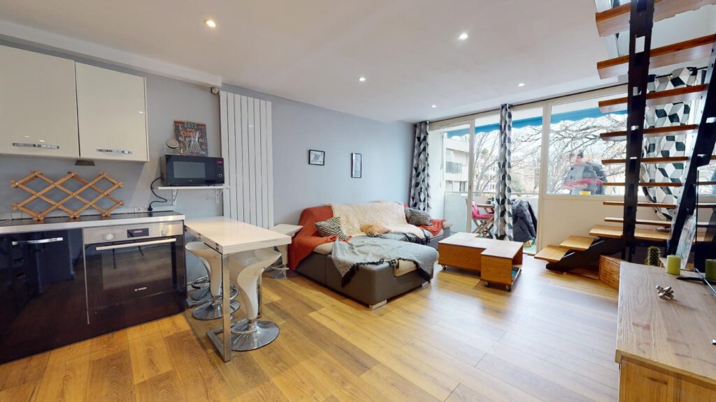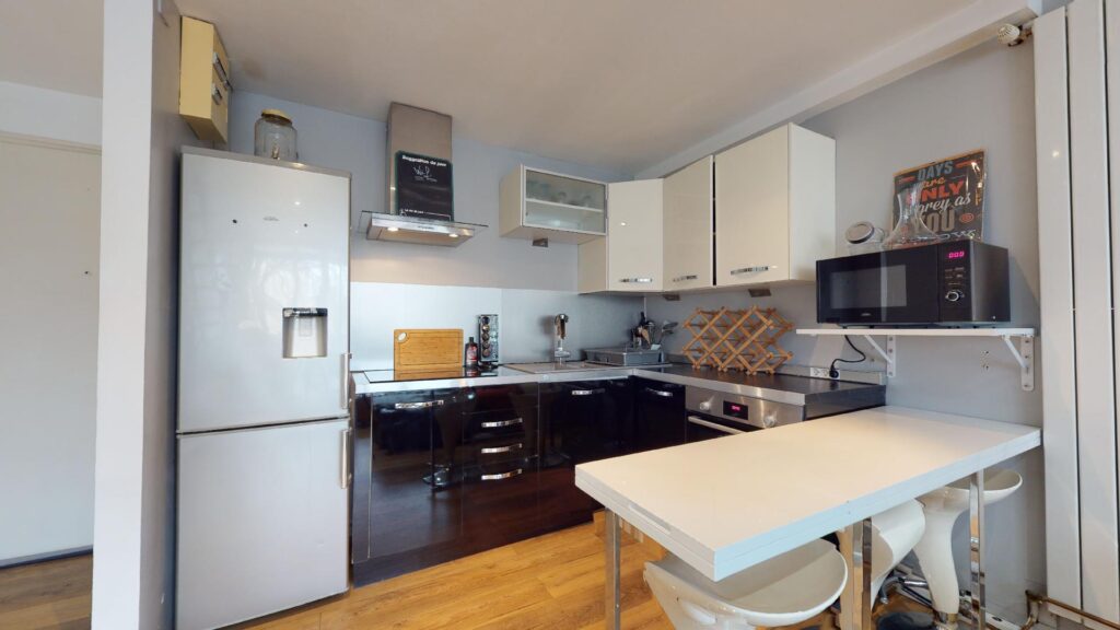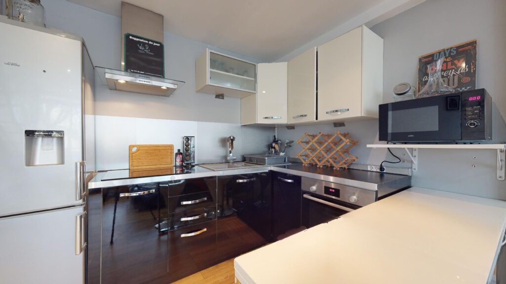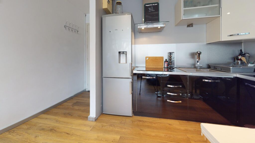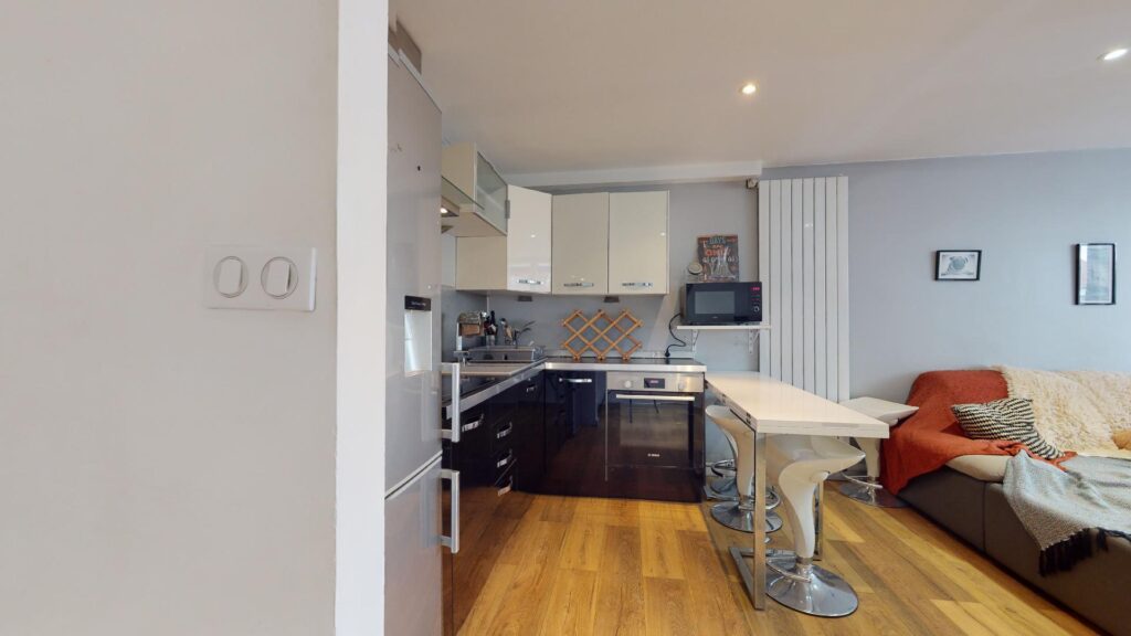 Le studio comporte un salon ouvert avec sa cuisine et lumineux grâce à sa baie vitrée donnant sur un charmant balcon. La cuisine est équipée d’un four, micro-ondes, plaques de cuisson, hotte, frigo,ainsi que de nombreux rangements et un mange debout.