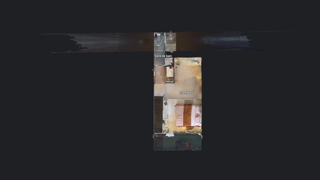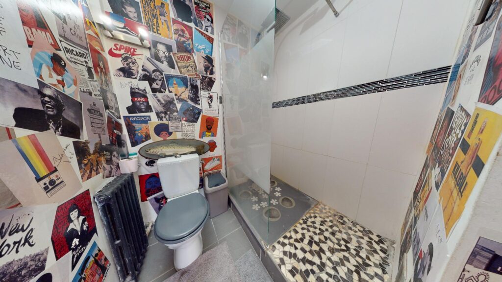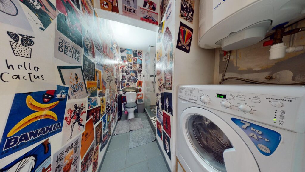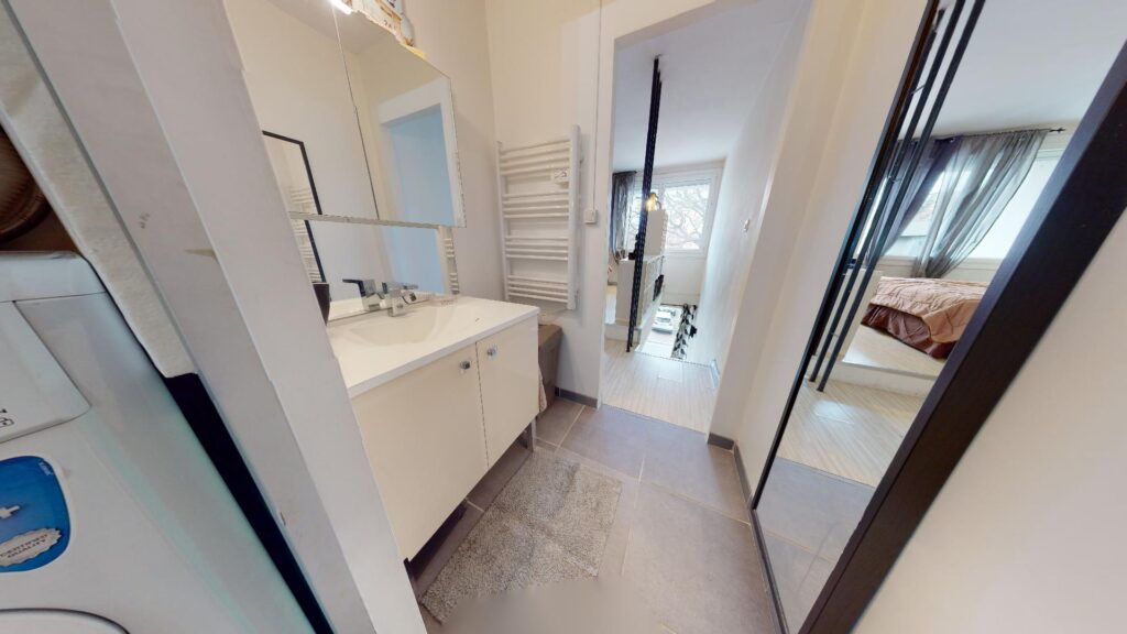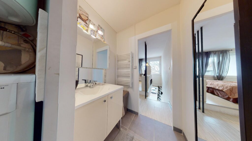 Enfin, séparé par un mur, la salle de bain et sa douche à l’italienne un grand miroir, un lavabo avec des rangements, une machine à laver, et un WC.