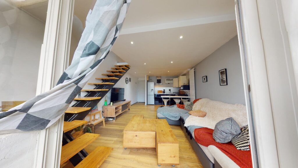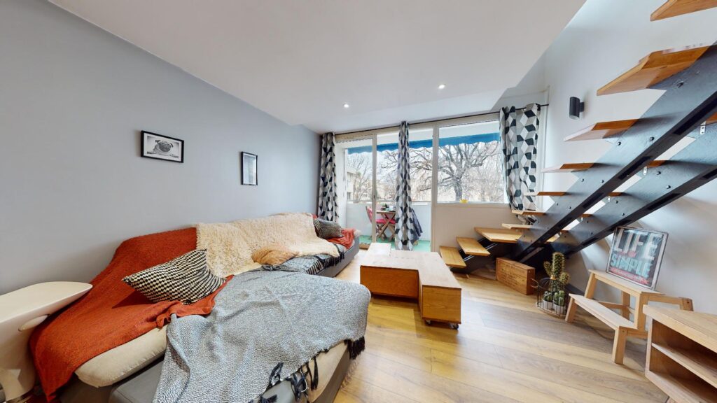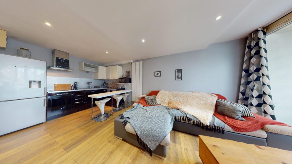 Le salon est lumineux et chaleureux avec son grand canapé ainsi qu’un meuble avec une TV écran plat et une table basse en bois accordé au sol de l’appartement.