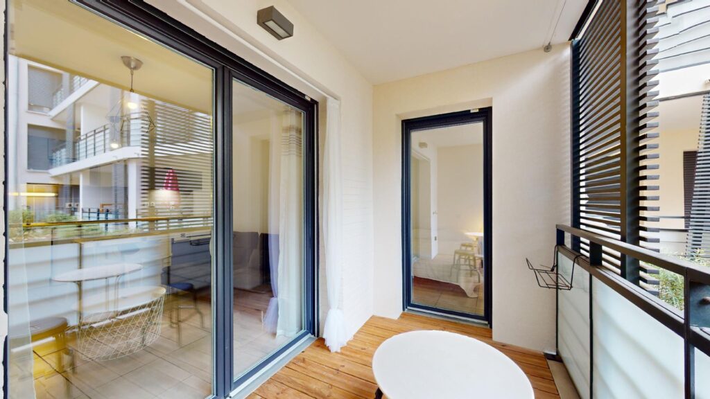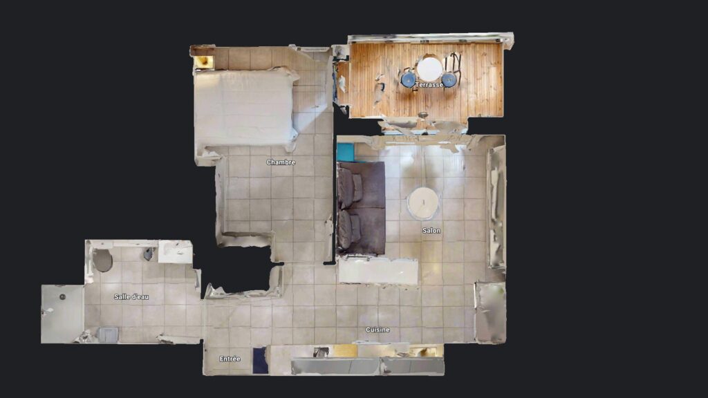 Le salon dispose d’un canapé, d’une table basse, d’un meuble TV et d’une TV. La terrasse dispose d’une table d’extérieur et de deux tabourets. La salle de bain se munit d’une douche, d’un WC et d’un meuble vasque. Enfin, la chambre dispose de plusieurs placards de rangement, d’une table de chevet avec lampe et d’un lit double.