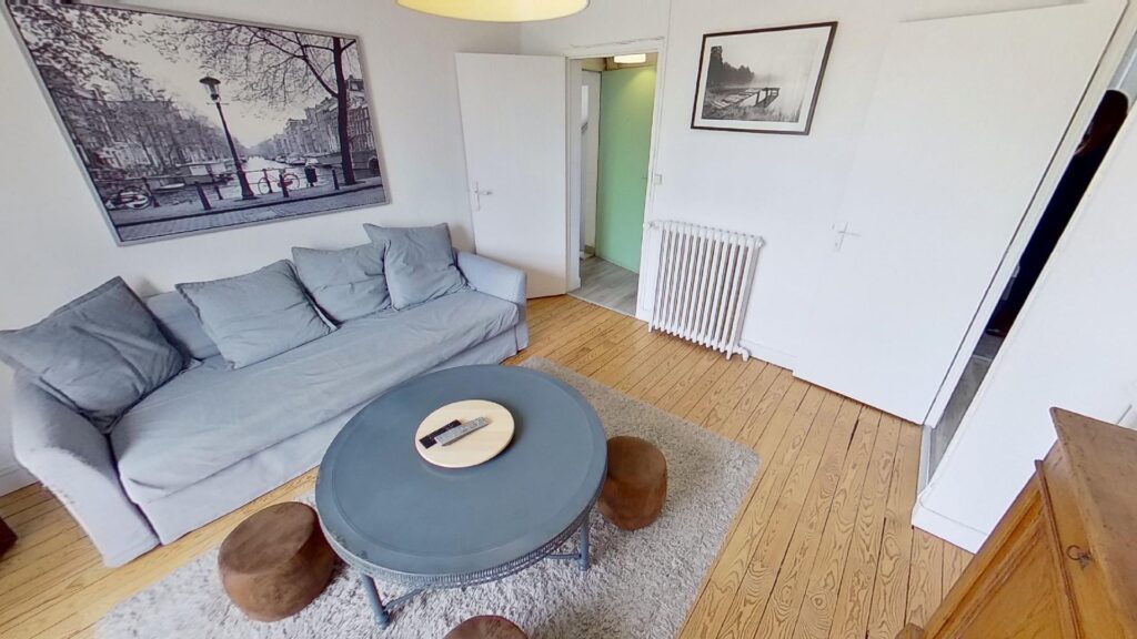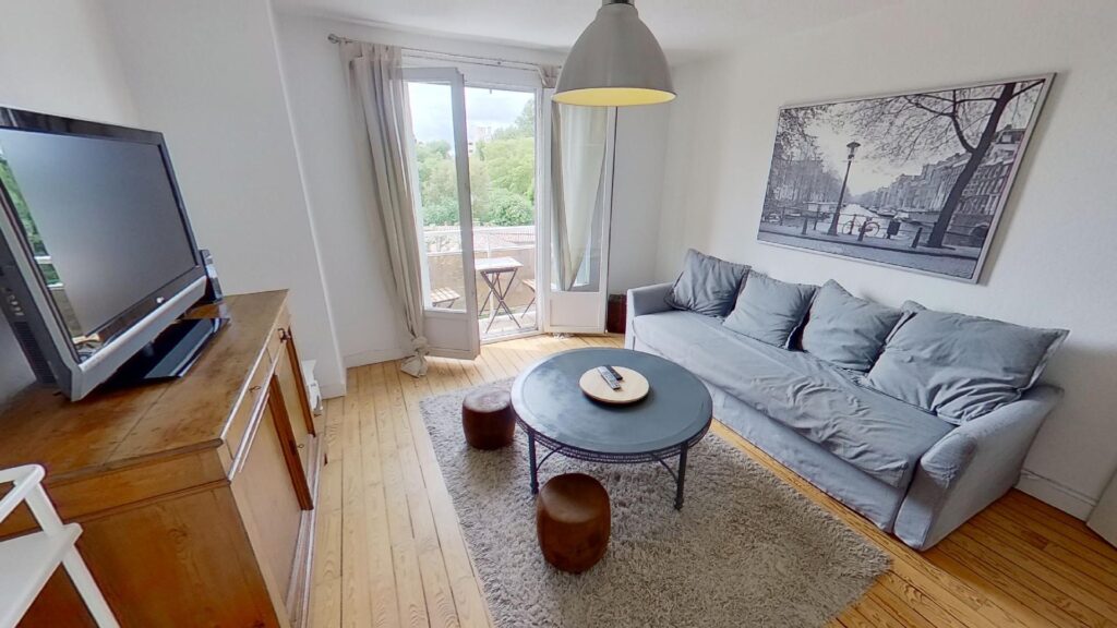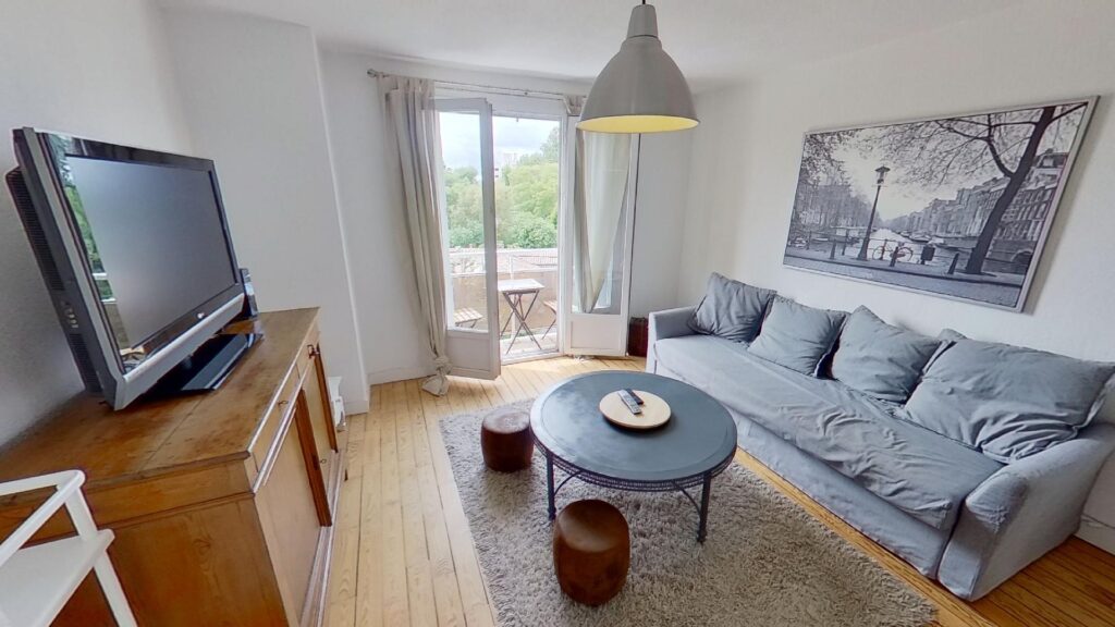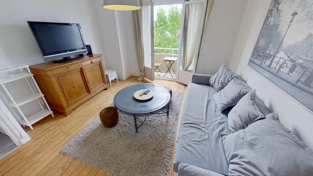 La porte d’entrée de l’appartement s’ouvre sur une cuisine séparée totalement équipée et fonctionnelle : un frigo, des plaques de cuisson, un four, une machine à café et de nombreux rangements. Le grand salon de 16m2 est aménagé avec un canapé, une table basse, un meuble TV et une télévision. Les baies vitrées du salon s’ouvrent sur un agréable balcon, avec table et chaise, offrant une vue dégagée et sans vis-à-vis.