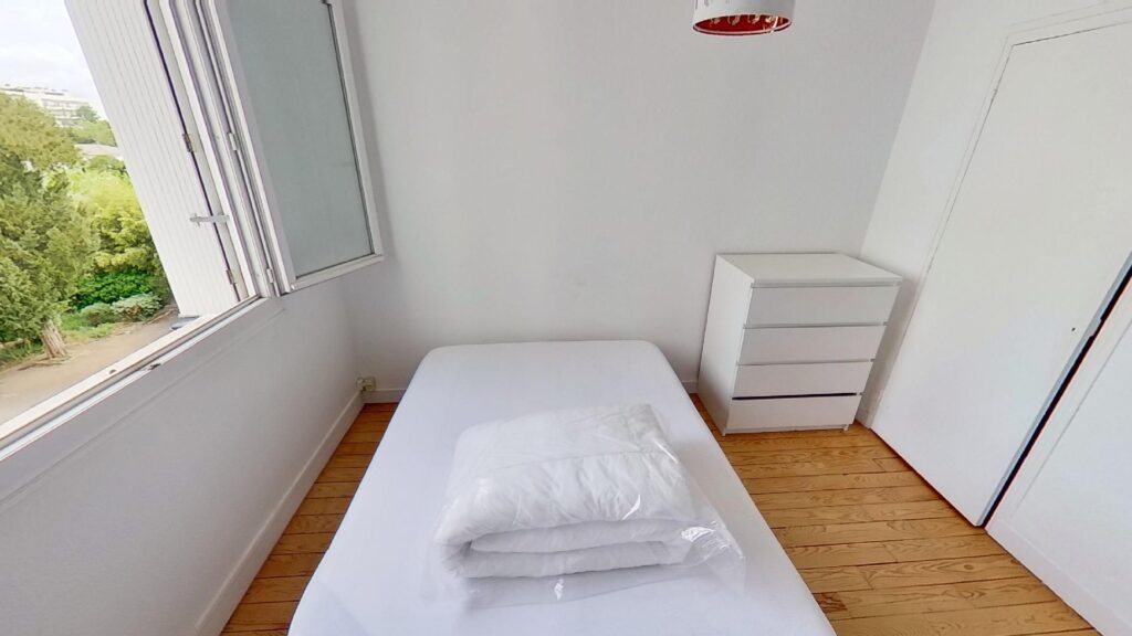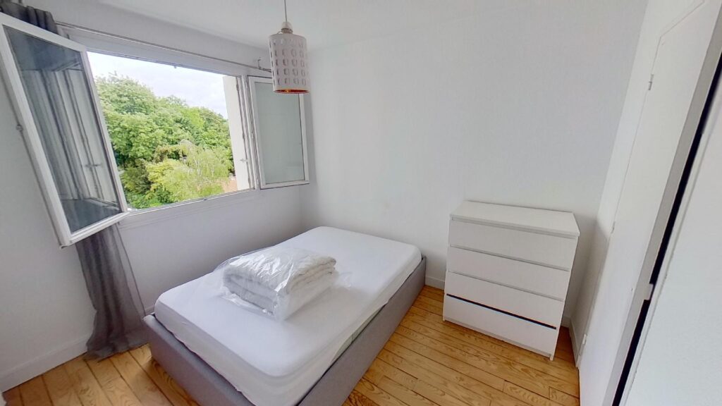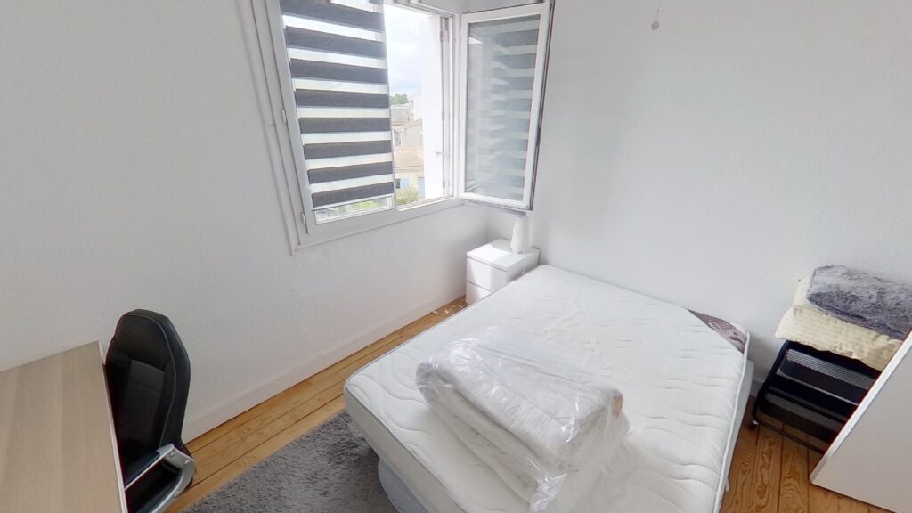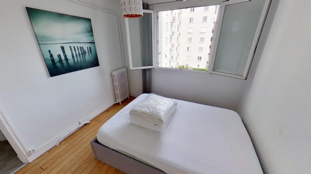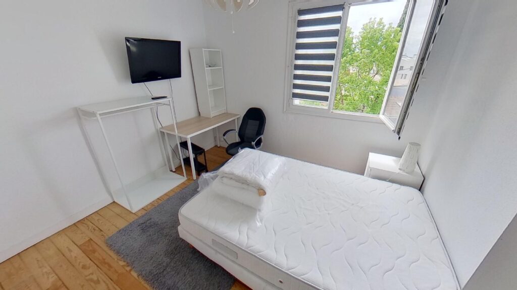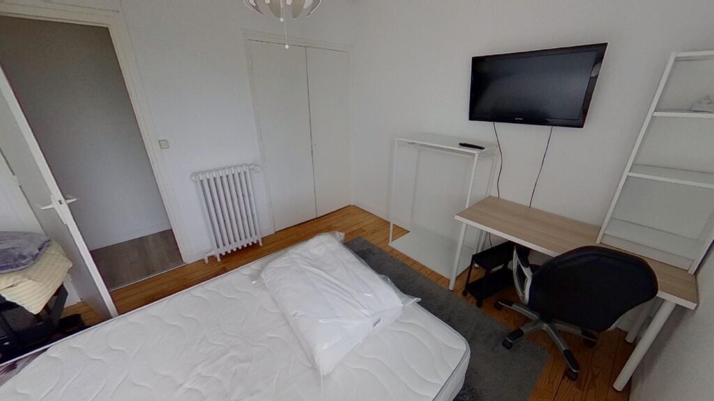 Ce T3 se compose donc de 2 chambres, d’environ 10m2 chacune, totalement aménagée et équipée. La première chambre se compose d’un lit double, d’une commode et d’un placard intégré. La seconde chambre quant à elle dispose du même équipement (un lit double, une penderie et un placard intégré) auquel s’ajoute un bureau, une chaise et une TV privative.