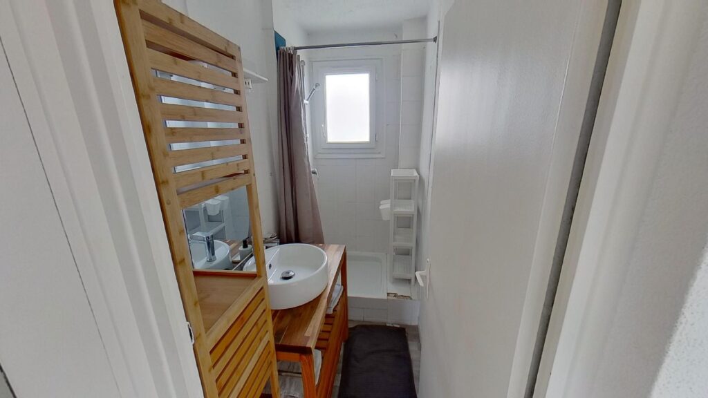 Une salle de bain avec douche et meuble vasque ainsi que des WC séparés (pas présent sur la visite virtuelle) viennent compléter l’aménagement de ce logement !