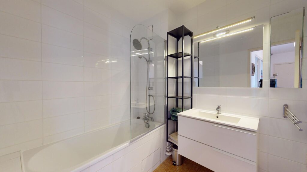 La salle de bain est composée d’une baignoire, une vasque, ainsi qu’une étagère de rangement.