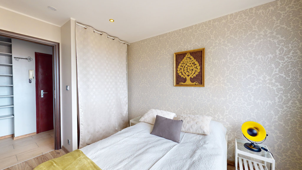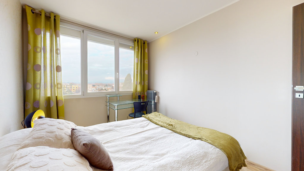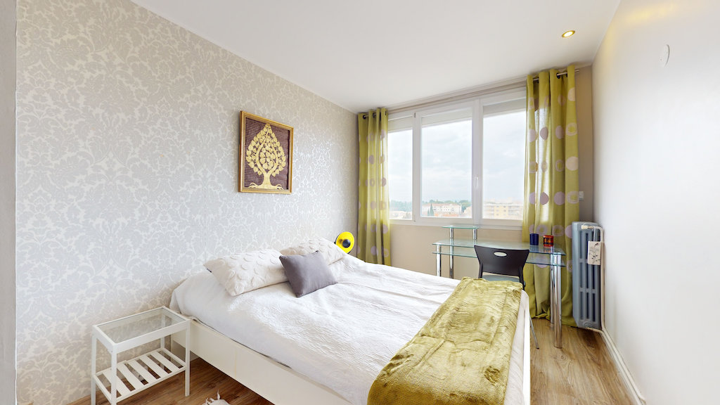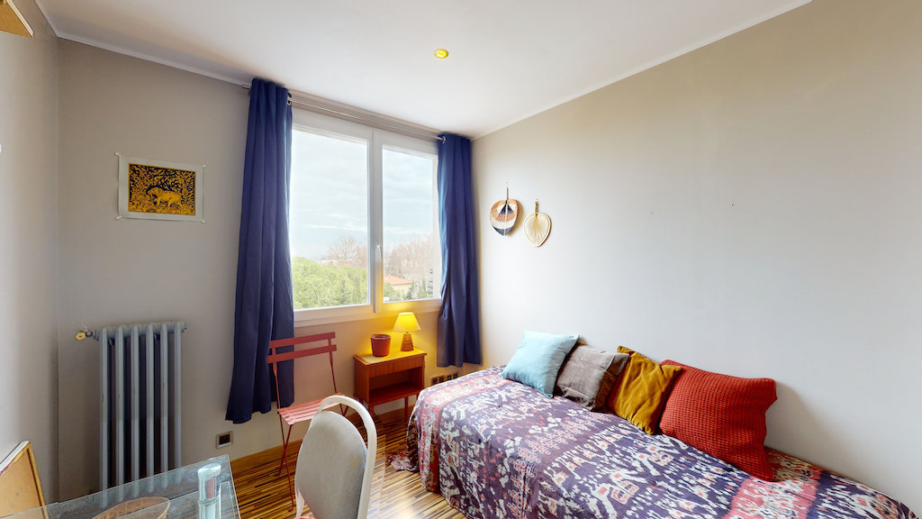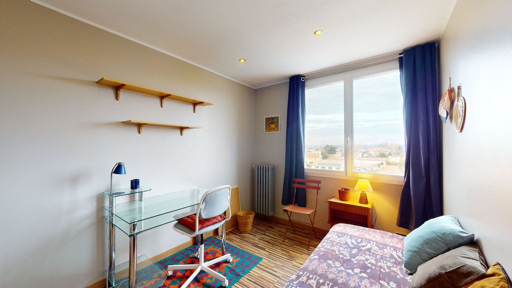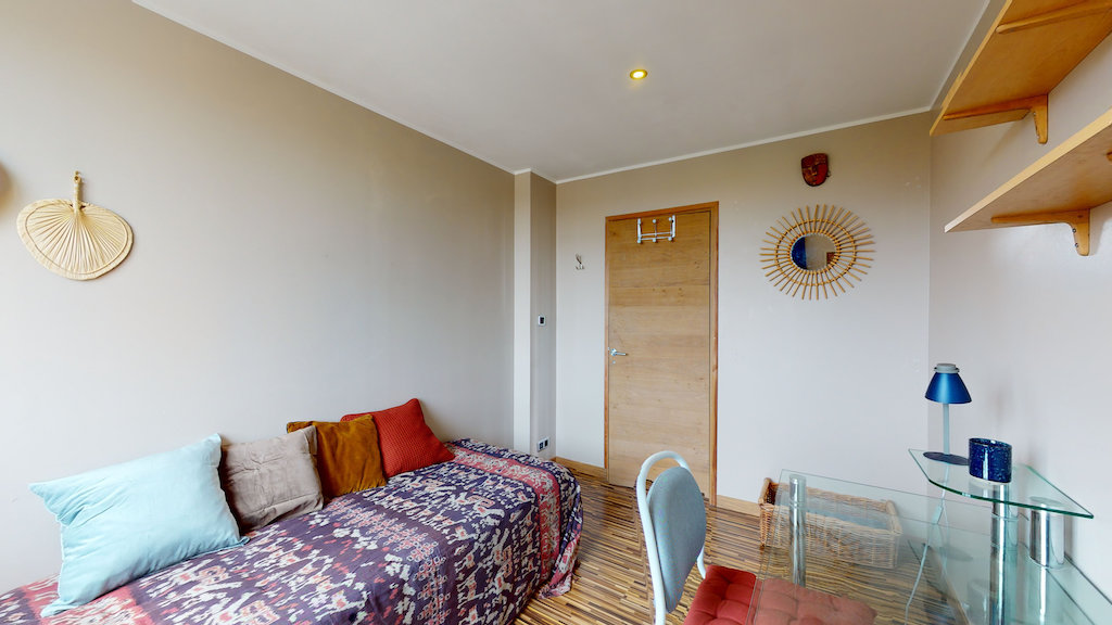 Cet appartement comporte donc 2 chambres. La première est aménagée avec lit double, un bureau, une chaise et des rangements. La deuxième est aménagée avec un lit simple, un bureau, une chaise et des étagères.