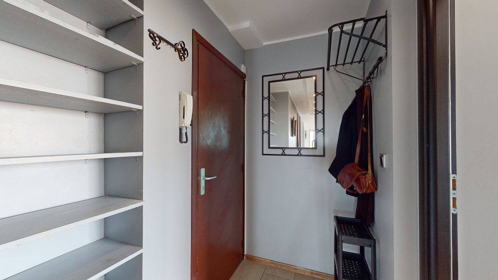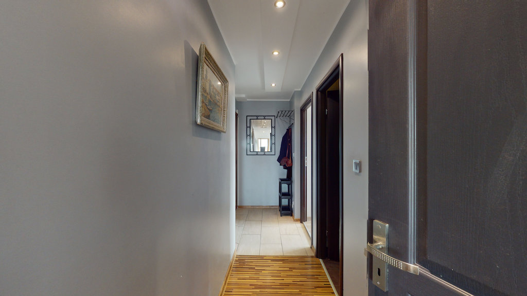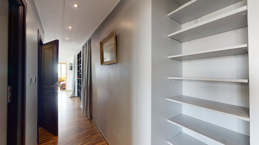 La porte d’entrée de cet appartement s’ouvre sur un couloir qui dessert notamment à pièce de vie de ce T3.