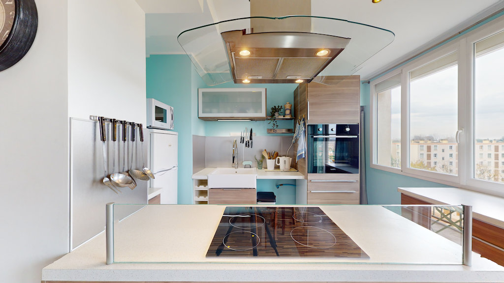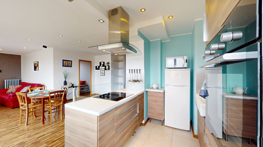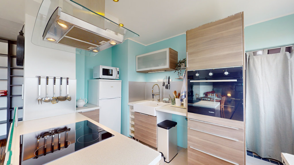 Cette cuisine moderne est entièrement équipée avec un four, des plaques de cuisson, une hotte, un micro-ondes, des rangements, etc,