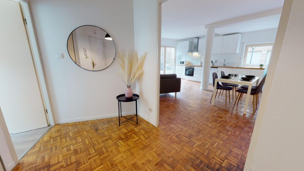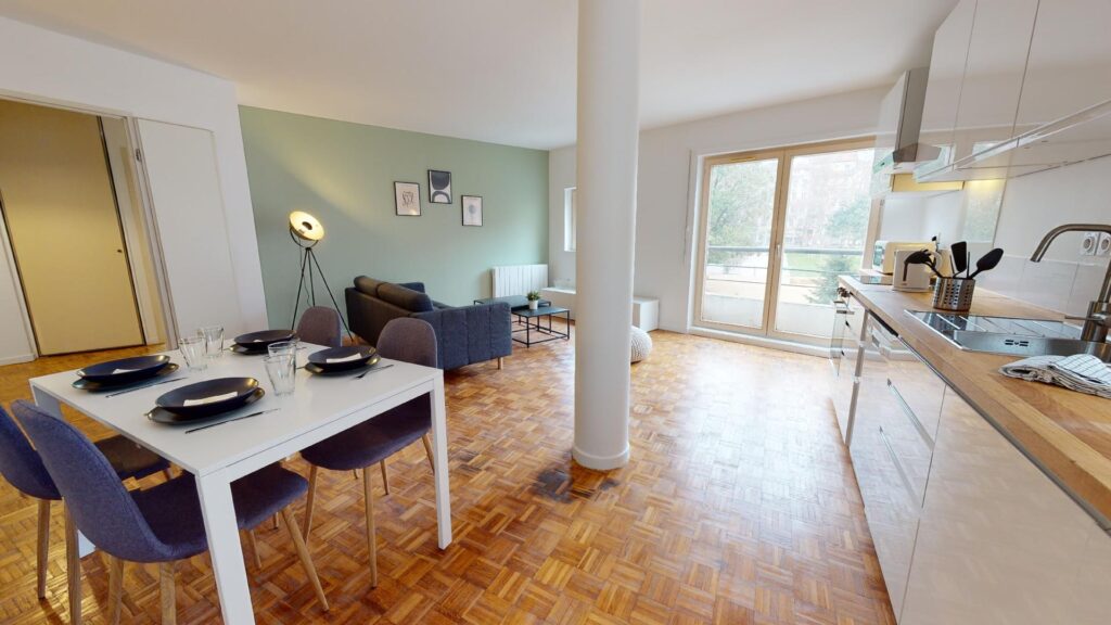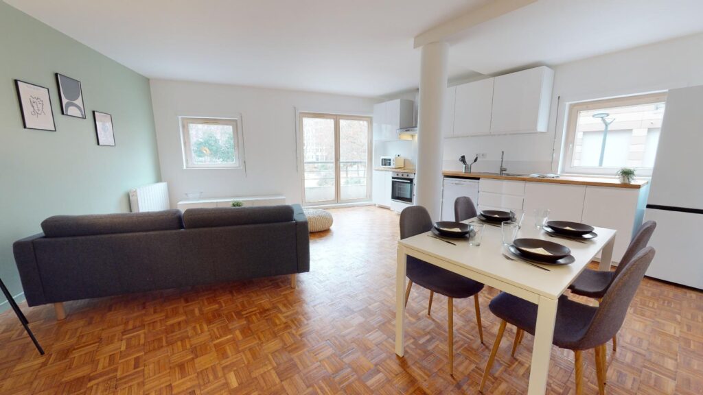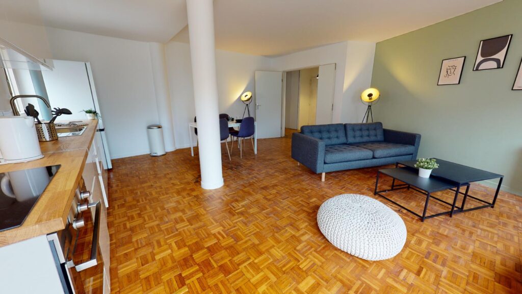 Ce superbe T4 s’ouvre sur une grande pièce à vivre avec un coin salon aménagé d’un canapé, deux tables gigognes, un pouf, un meuble TV et une lampe. Le coin salle à manger dispose d’une table avec quatre chaises.