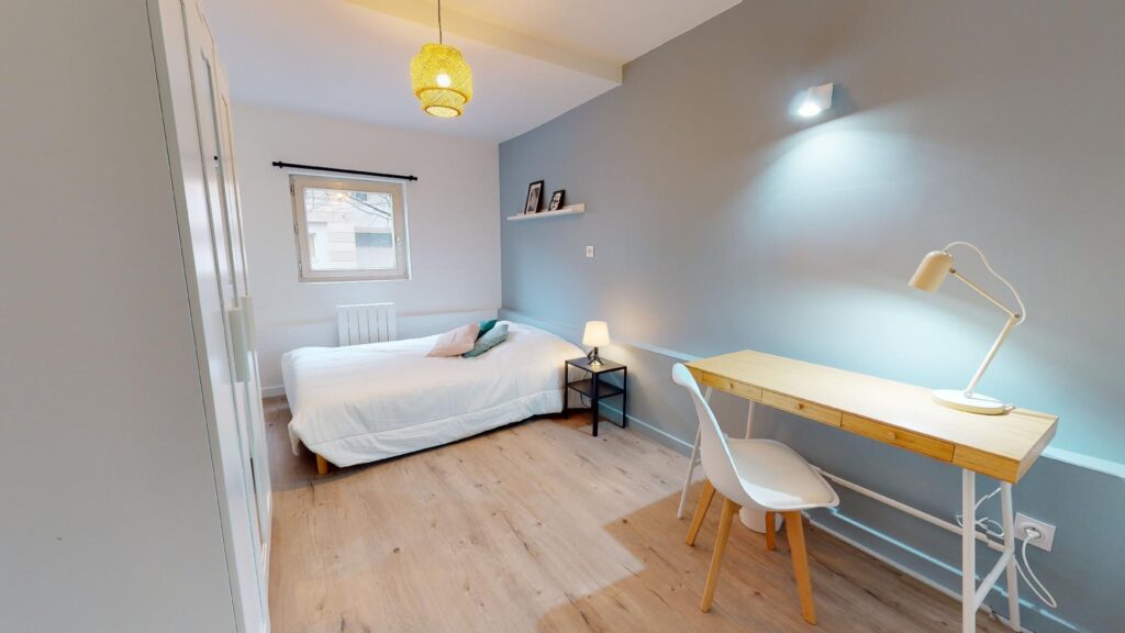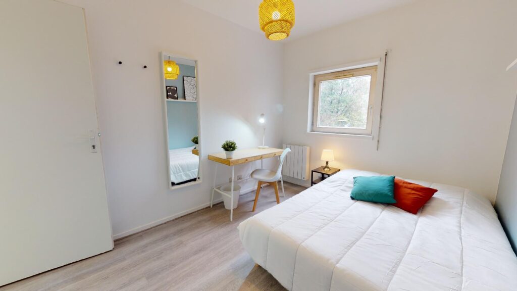 La seconde chambre, très lumineuse, est aménagée avec un lit double, un miroir plein pied, un bureau avec chaise et lampe, une petite poubelle, une table de chevet avec lampe et un grand placard mural.