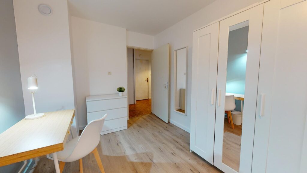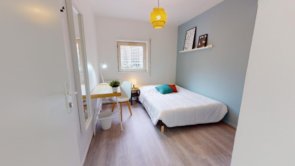 La première chambre est parfaitement aménagée d’un lit double, un miroir plein pied, un bureau avec chaise et lampe, une table de chevet avec lampe, une petite poubelle et un grand placard mural.