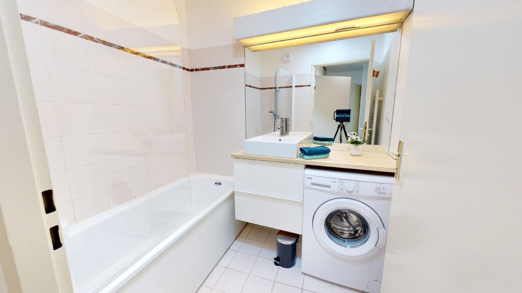 La salle de bain avec toilettes séparées dispose d’une baignoire, un meuble vasque et une machine à laver.